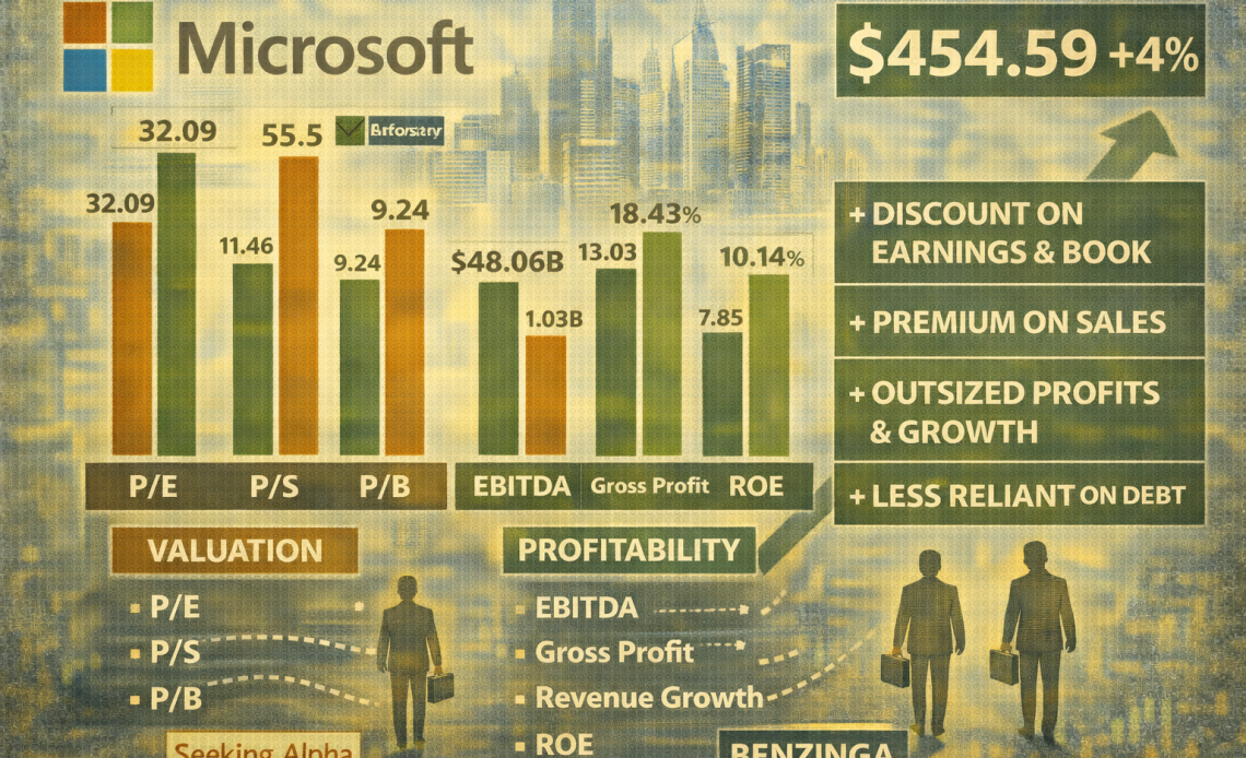 Benzinga’s data shows Microsoft trading at a discount on earnings and book, a premium on sales, and delivering above-average growth with strong profit scale and low leverage.